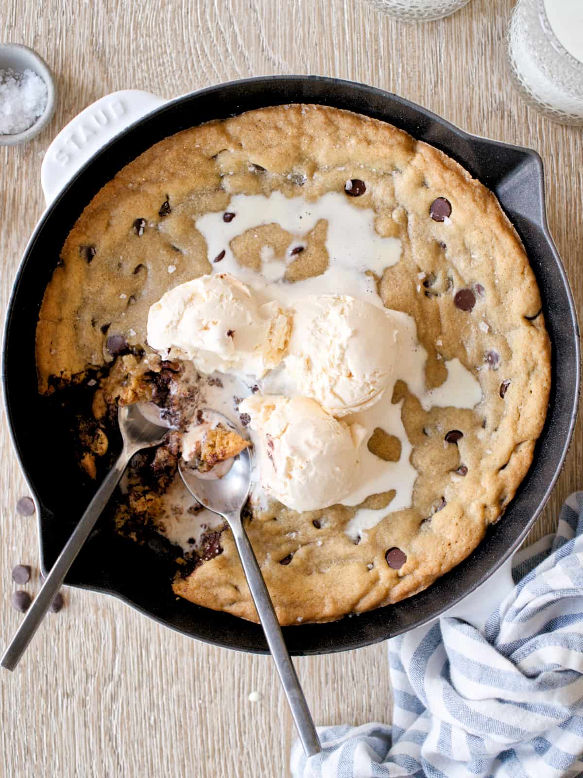 Sugar: This recipe calls for light brown sugar and cane sugar. A mixture of the two balances the flavor, texture, and spread. Light brown sugar has molasses, which adds more moisture to your skillet cookie. Cane sugar adds a clean sweetness and helps with browning. You can substitute cane sugar with granulated sugar at a 1:1 ratio.