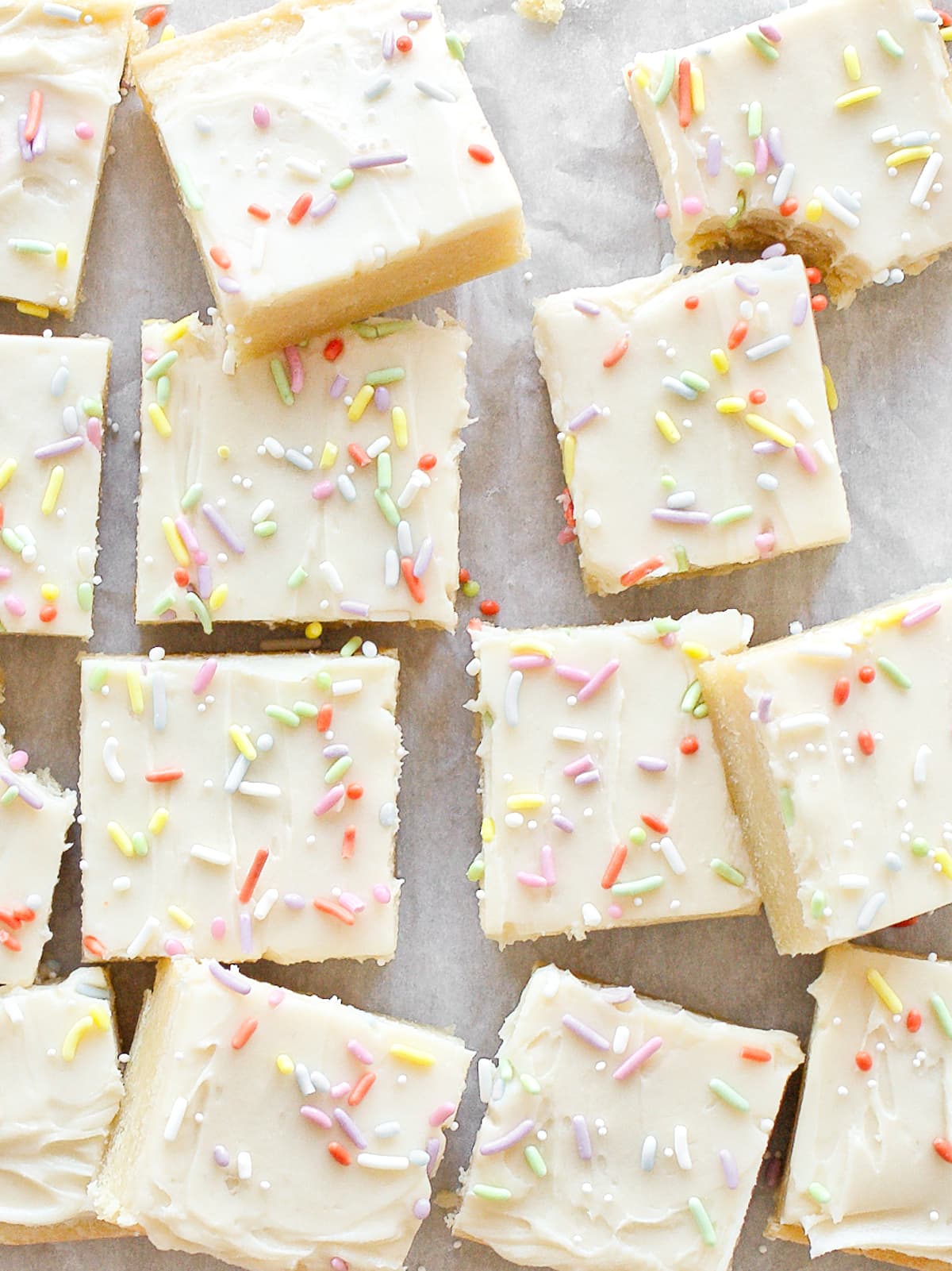 - Frost the bars. Once the bars have completely cooled, remove from the pan by lifting the parchment paper. Spread the frosting over the cookie bars and decorate with sprinkles, if using. Slice into 16 square bars and serve.